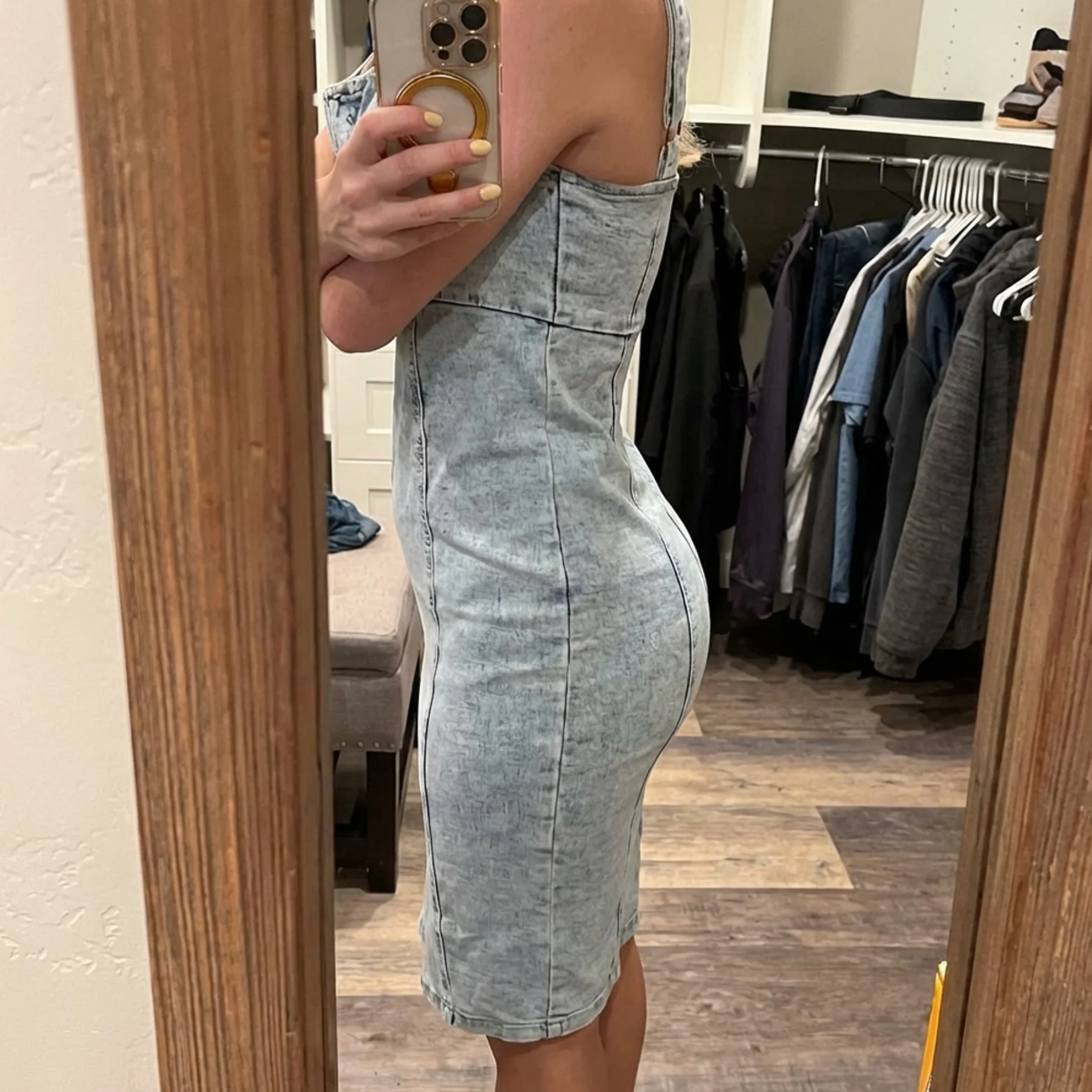 Designed with a flattering bodycon fit, this denim dress gently hugs your curves while still feeling comfortable to wear. The stretchy denim fabric allows the dress to move naturally with your body, so you don’t feel restricted throughout the day. It’s fitted in all the right places while still giving you the flexibility and comfort you need.